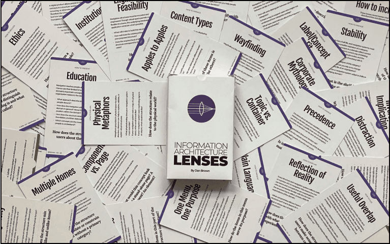 To bring information architecture tools to more designers, Dan created the Deck of IA Lenses, a set of cards with prompts for evaluating information architecture work.
